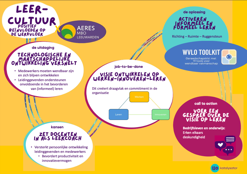 Aeres MBO Leeuwarden richt zich op het creëren van een positieve leercultuur binnen bedrijven door te werken met het principe van Richting, Ruimte en Ruggensteun. Richting helpt medewerkers helder te krijgen waar ze naartoe willen groeien. Ruimte geeft ze de tijd om te leren zonder druk om meteen te presteren, en Ruggensteun zorgt voor actieve begeleiding en aanmoediging door leidinggevenden en collega’s. Dit stimuleert medewerkers om te blijven leren, nieuwe dingen uit te proberen en te durven falen. Hierdoor worden organisaties wendbaarder en innovatiever, terwijl medewerkers zich gesteund voelen in hun groei.