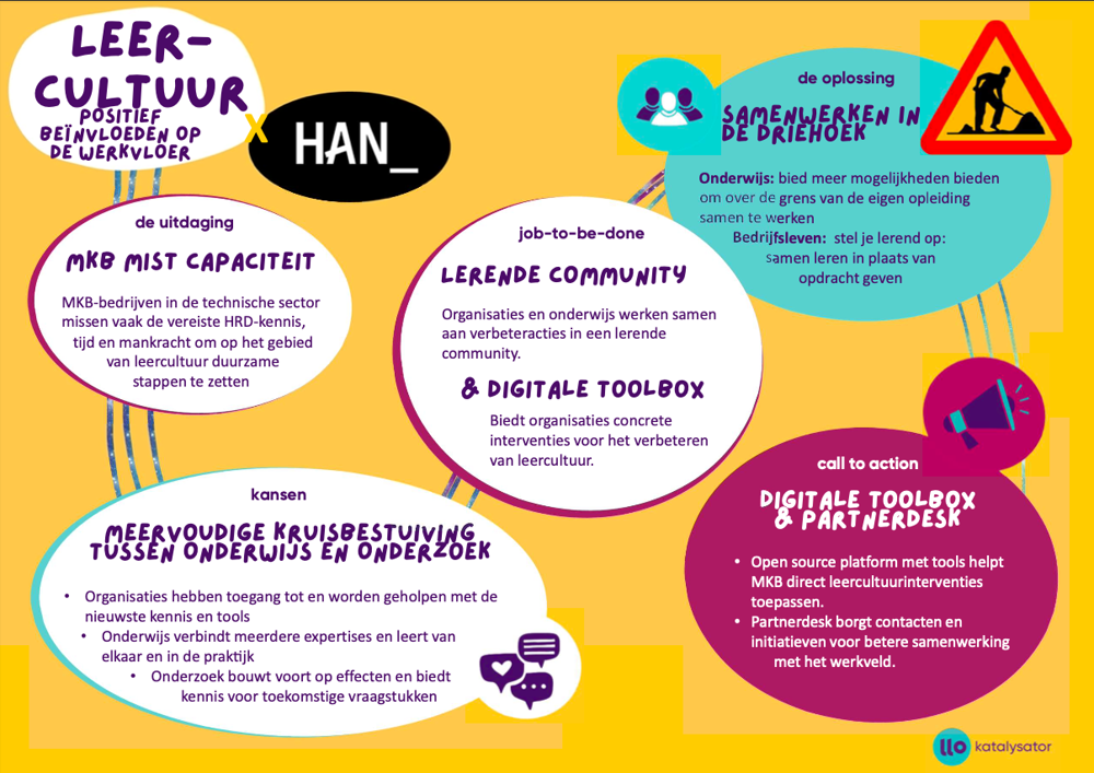 De HAN zet in op de Driehoeksamenwerking, waarbij onderwijs, bedrijven en onderzoeksinstellingen nauw met elkaar samenwerken. Dit betekent dat onderwijsprogramma’s worden afgestemd op de actuele behoeften van bedrijven, zodat medewerkers leren wat echt nodig is. Onderzoekers delen hun nieuwste inzichten, die direct toepasbaar zijn in de praktijk. Bedrijven brengen op hun beurt praktijkervaring terug naar het onderwijs, zodat lessen up-to-date blijven. Dit zorgt ervoor dat medewerkers altijd over de juiste kennis en vaardigheden beschikken, terwijl onderwijs en bedrijfsleven elkaar versterken.