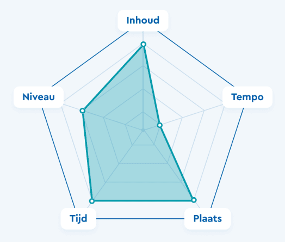 Bij Lars past prima een gefaciliteerde leerroute. Dit geeft hem houvast en structuur. Zeker in het eerste jaar is de nieuwe leeromgeving wennen en ligt er al voldoende druk op het zelfstandig leren en studeren. Lars is tevreden met het huidige studietempo en heeft geen behoefte om het te versnellen of te vertragen.