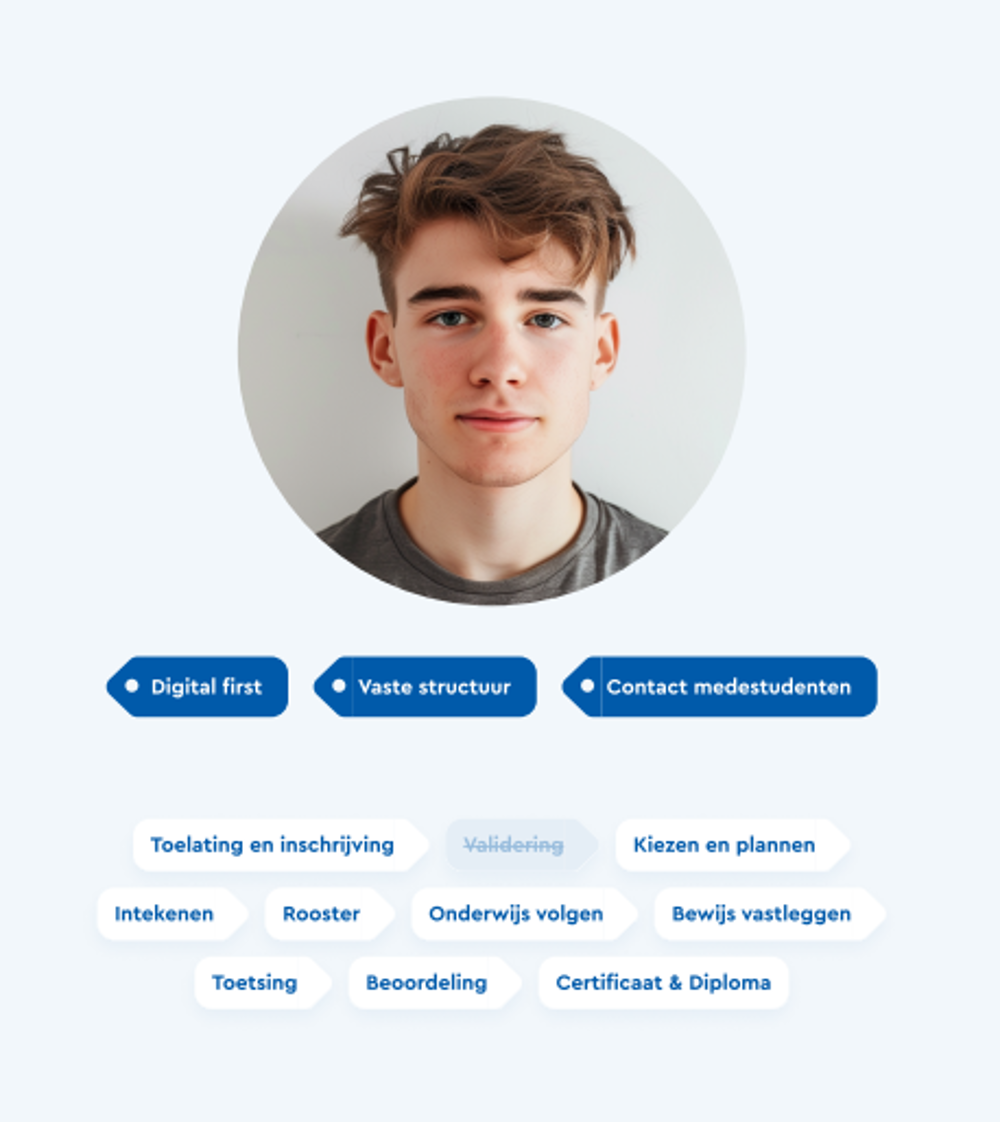 Lars komt net van de HAVO en is gewend aan een vast gestructureerd onderwijsprogramma. Hij is begonnen aan de voltijd Bachelor Bedrijfskunde. Hij presteert goed in een traditionele klasomgeving waar hij direct contact heeft met docenten en medestudenten. Zijn interesses zijn nog breed en hij weet nog niet precies wat hij later wil doen. Lars is ondernemend ingesteld en vindt het leuk om met andere mensen samen te werken. Hij heeft een bijbaantje in de horeca, waardoor hij overdag alle tijd heeft om naar school te gaan en te studeren.