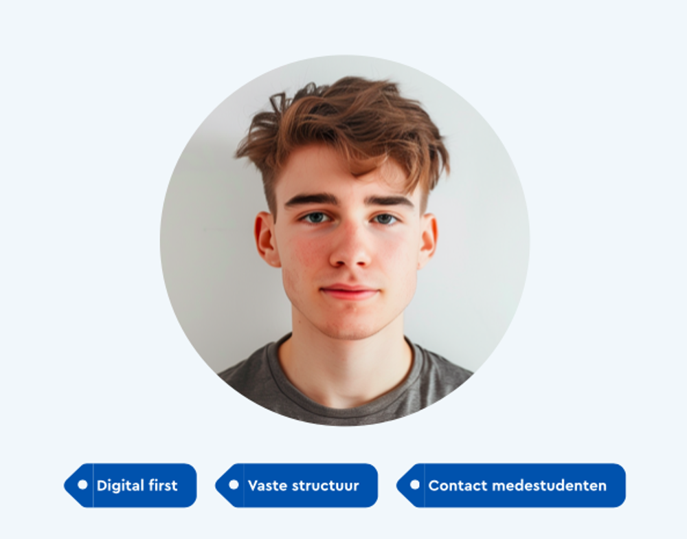 Lars is een voltijdstudent die net van de havo komt. Hij heeft baat bij overzicht, leren in klasverband en een duidelijk studietempo. Voor Lars werkt een gefaciliteerde leerroute, met vaste momenten, begeleiding en voorspelbaarheid. Structuur geeft hem de ruimte om te groeien.